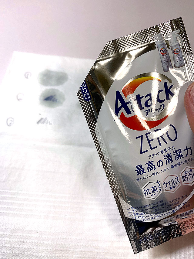 今回いくつかの方法で試してみたところ「無水エタノール」で処理したあと、まだ汚れが残るようなら「液体洗剤」を馴染ませてから洗濯を行うと、それぞれ片方だけの処理をした時よりも、きれいになりました。