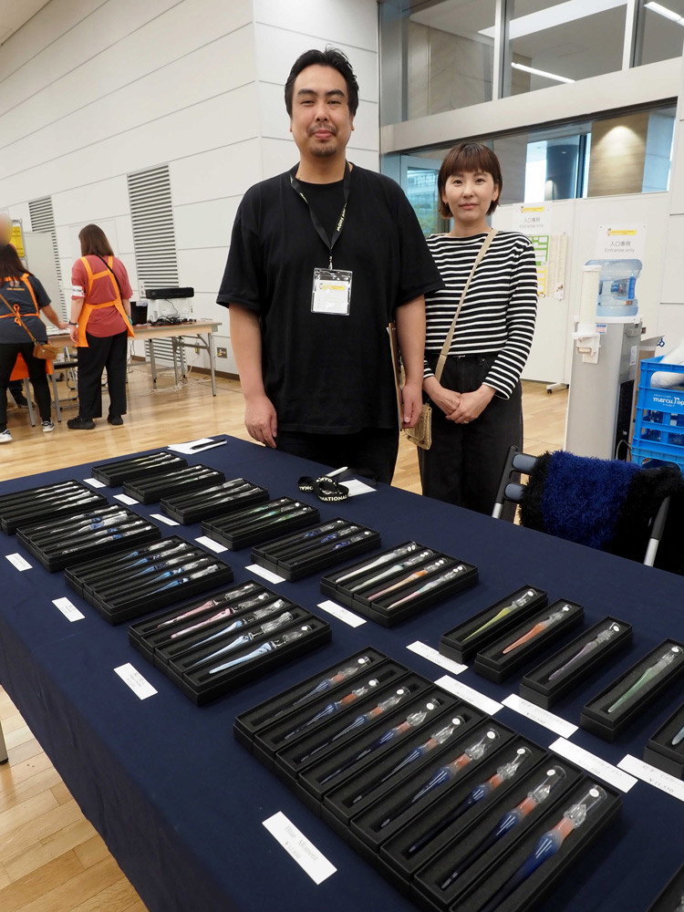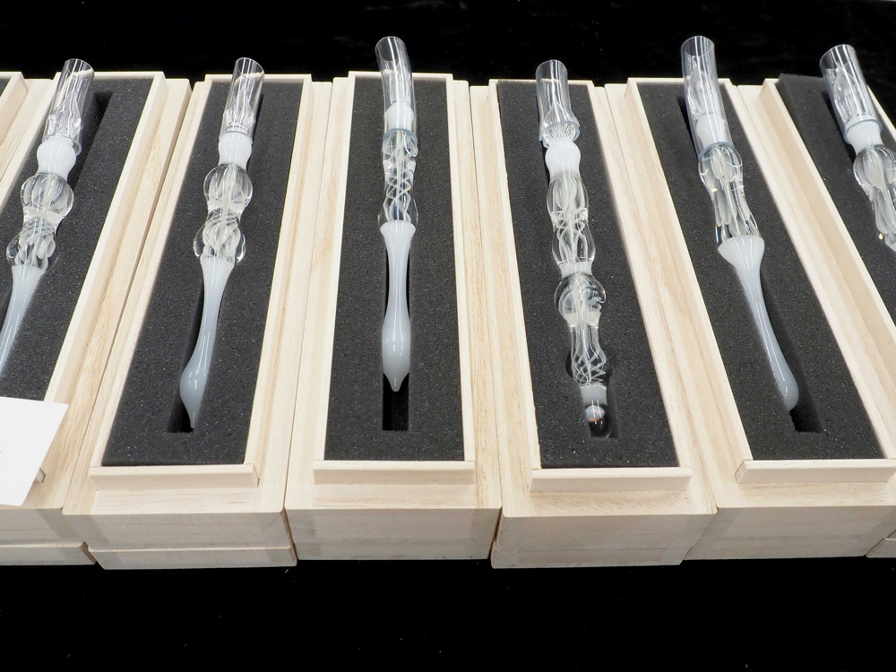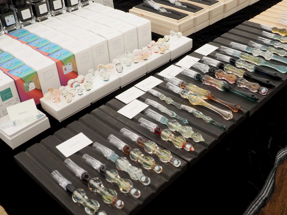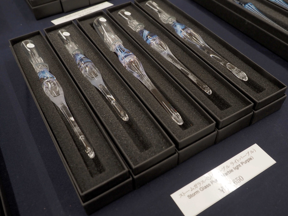 毎年11月に開催される「東京ペンショー」では、秋をカラーテーマにしたモデルを中心に販売してきましたが、今年はひと足早く冬をイメージさせる「白」を基調にしたモデル「稜線」「流線」「旋」「矢絣」他を投入、会場に訪れた人を美しいガラスペンの世界へと誘います。