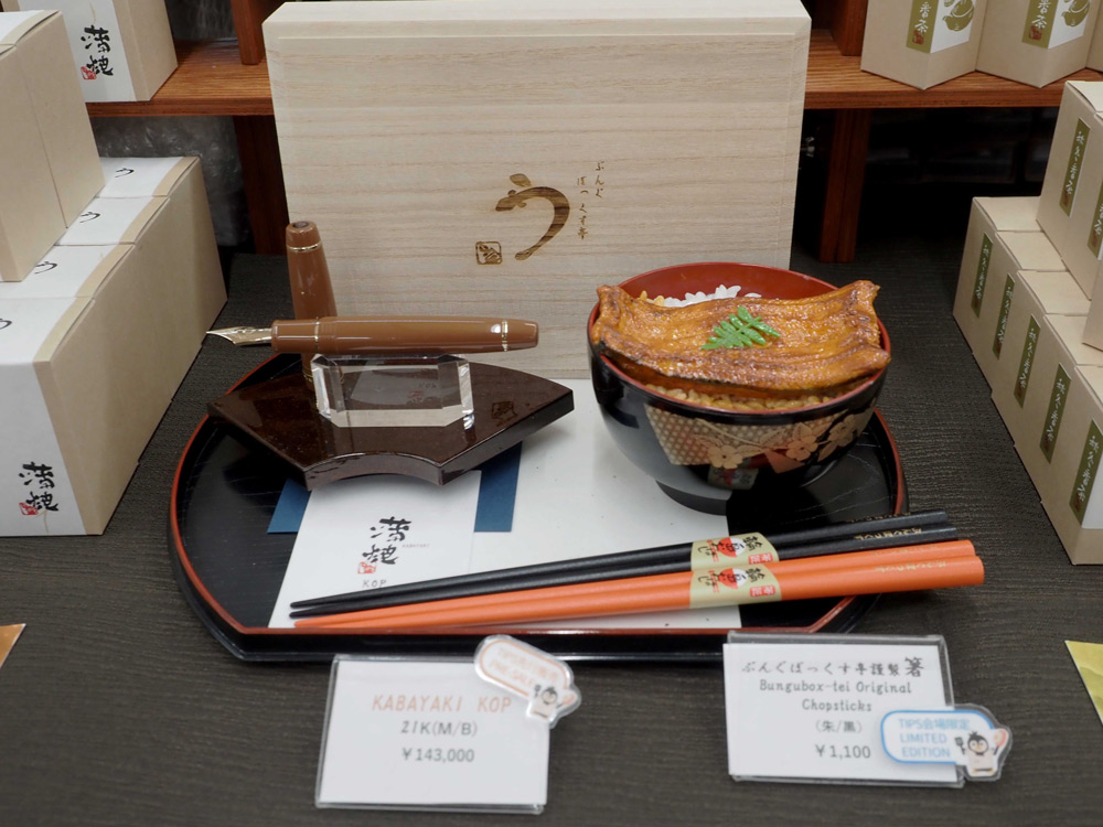 高級料亭をイメージして作られた「蒲焼き万年筆」は、見ているだけであのタレの香ばしいかおりが漂ってきそうです。合わせて料亭風の「ぶんぐぼっくす亭」木製看板も今回のために作られたそうです。