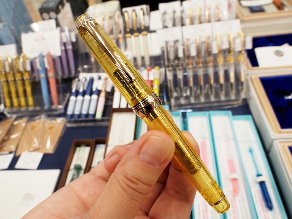 会場に並んだオリジナル万年筆「天日」は、マレーシアペンショー、台南ペンショーなど世界のペンショー会場を経て、いよいよ日本に上陸。天日=太陽をイメージしたモデルで、イエローカラーのボディに輝く太陽をラメで表現した、持っているだけで元気が湧いてくる万年筆ですが、ナガサワ文具センターの店頭での販売はなく、各地のペンショー会場でのみ販売される特別な1本です。