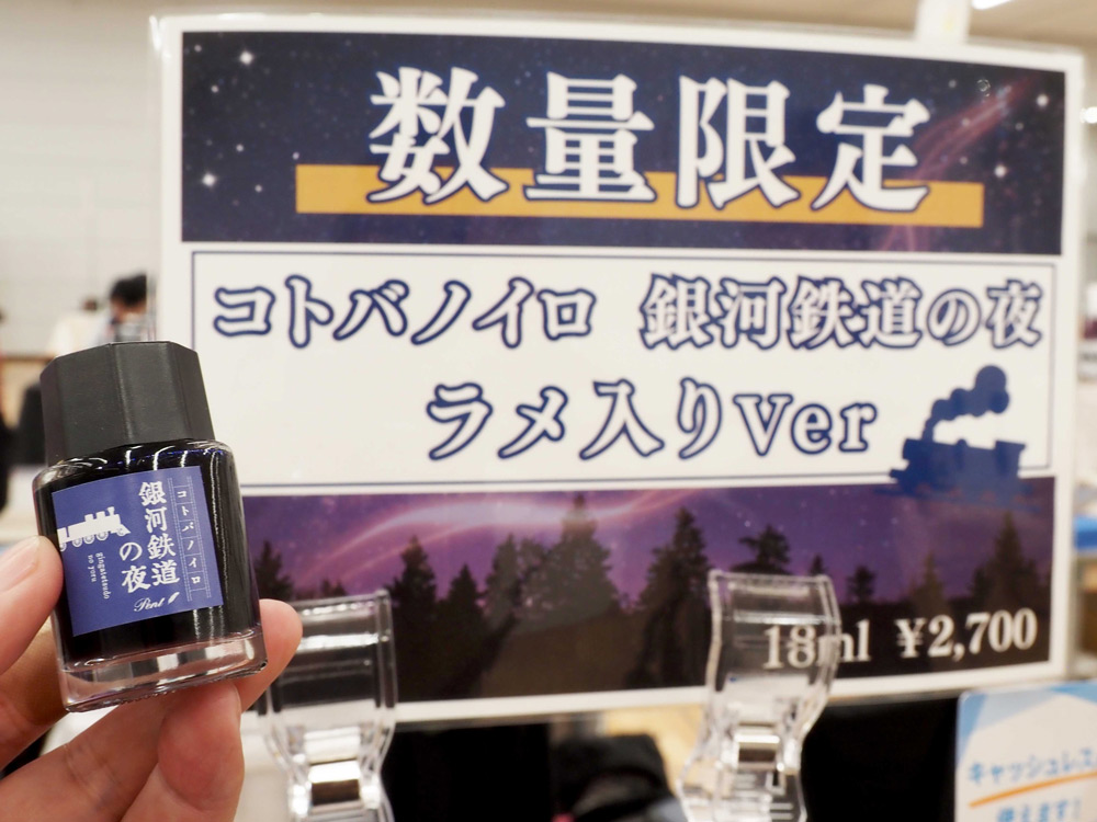 「世界の筆記具ペンハウス」で人気のオリジナルインク「銀河鉄道の夜」が、ラメ入りインクとして登場、ラメの輝きがジョバンニが見た車窓の風景を思い起こさせてくれます。その人気ぶりは会期中に予定数を完売するほどでした。
