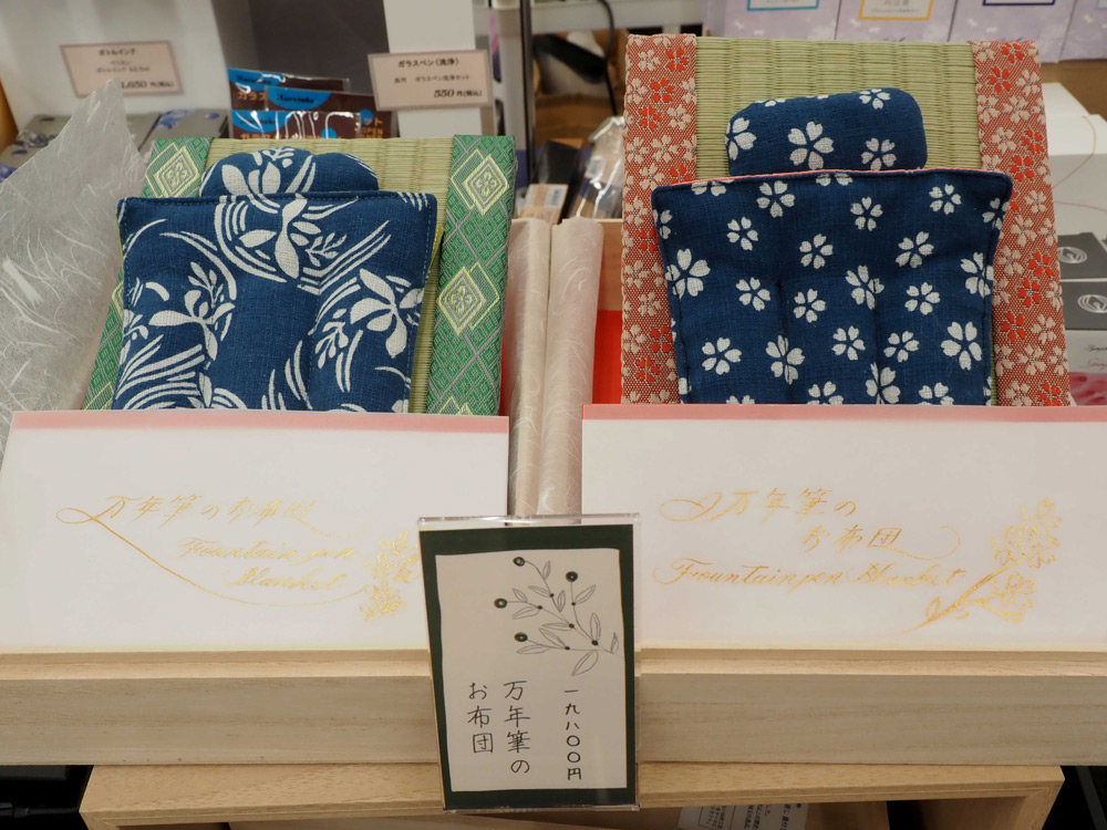 合わせて出品された、「万年筆のお布団」は、松本市(長野県)の藍染め職人の手で染められた素地を使い、大切な万年筆を1本1本しっかり守ってくれるほか、自宅に帰れば”枕”をそえる仕様になっていて、日本の伝統と発想のユニークさがフュージョンした、なんとも心憎いペンケースです。