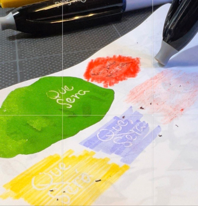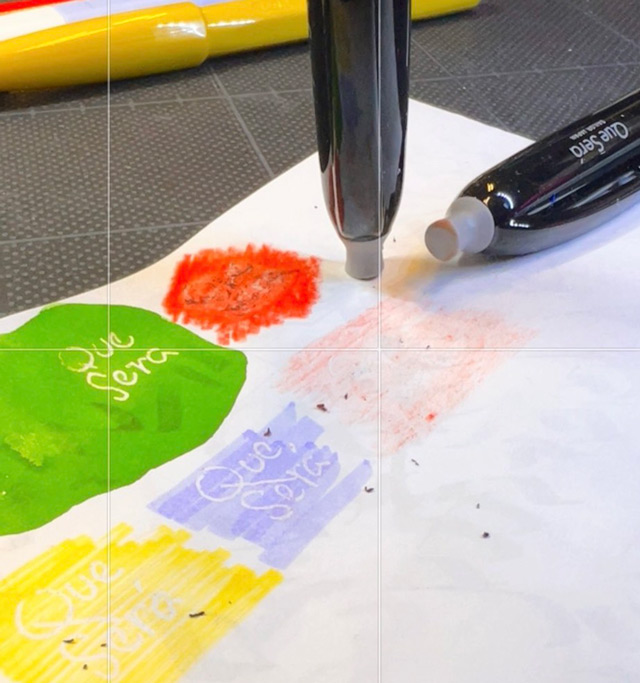 ケセラは線画の上に、染料インクや蛍光ペンなどで上書きした後、
